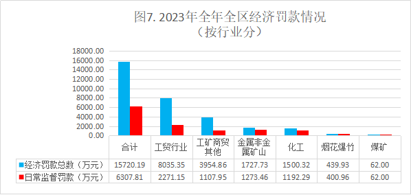 2023年全年全区共实施经济处罚罚款1.5720亿元,其中对煤矿罚款62万元,对金属非金属矿山罚款1727.73万元,对化工罚款1500.32万元,对烟花爆竹罚款439.93万元,对工贸罚款8035.35万元,对工矿商贸其他罚款3954.86万元。详见图7、图8。