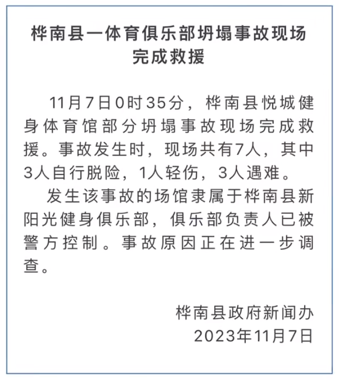 发生该事故的场馆隶属于桦南县新阳光健身俱乐部,俱乐部负责人已被警方控制。事故原因正在进一步调查。
