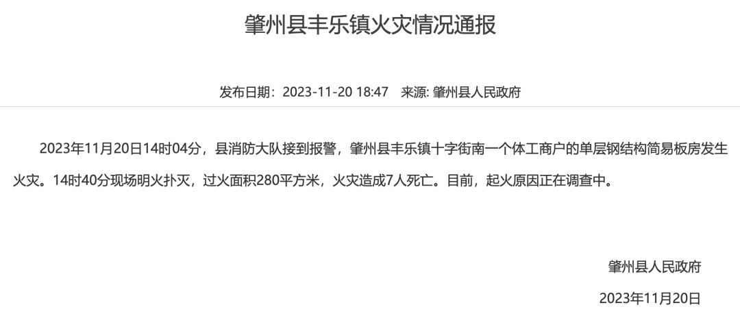 此外,另据黑龙江大庆市肇州县人民政府通报,11月20日14时04分,肇州县消防大队接到报警,该县丰乐镇十字街南一个体工商户的单层钢结构简易板房发生火灾。14时40分,现场明火扑灭,过火面积280平方米。火灾造成7人死亡。