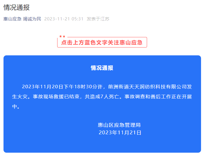 据江苏无锡市惠山区应急管理局11月21日通报,11月20日18时30分许,前洲街道天天润纺织科技有限公司发生火灾。事故现场救援已结束,共造成7人死亡。事故调查和善后工作正在开展中。