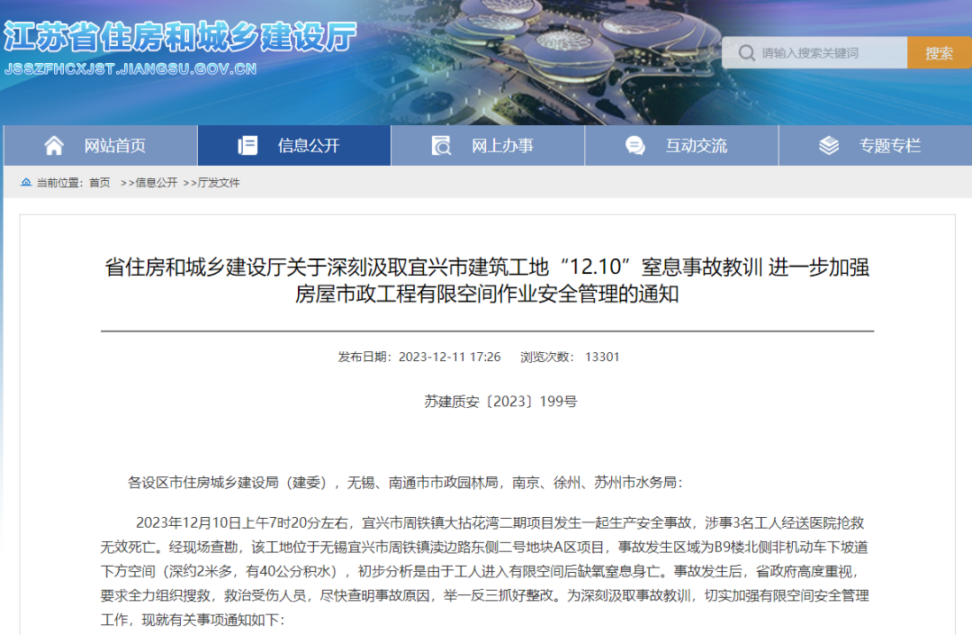 经现场查勘,该工地位于无锡宜兴市周铁镇渎边路东侧二号地块A区项目,事故发生区域为B9楼北侧非机动车下坡道下方空间(深约2米多,有40公分积水)。初步分析是由于工人进入有限空间后缺氧窒息身亡。