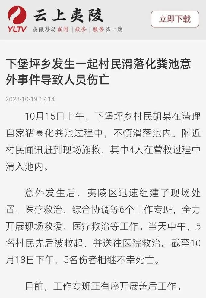 10月15日,湖北省宜昌市下堡坪乡村民胡某在清理自家猪圈化粪池过程中,不慎滑落池内。附近村民闻讯赶到现场施救,其中4人在营救过程中滑入池内。事故造成5人全部身亡。