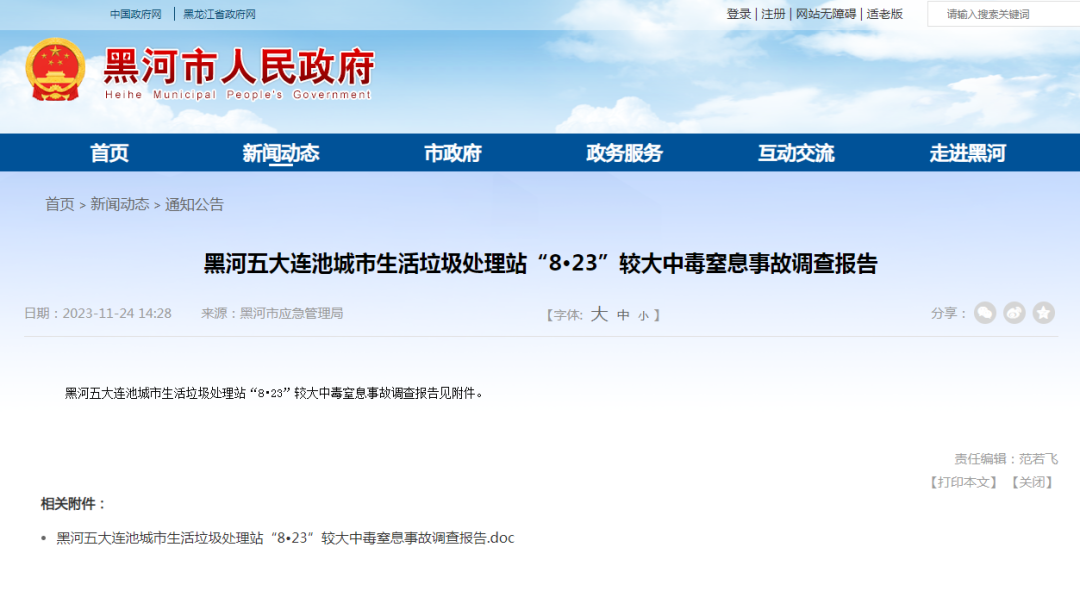 8月23日,黑龙江省黑河市五大连池市城市生活垃圾处理站在垃圾渗滤液抽取处理过程中1名工人不慎跌入临时储罐(有限空间),其他人员盲目施救,吸入过量有害气体中毒窒息。事故造成4人死亡,直接经济损失297万元。