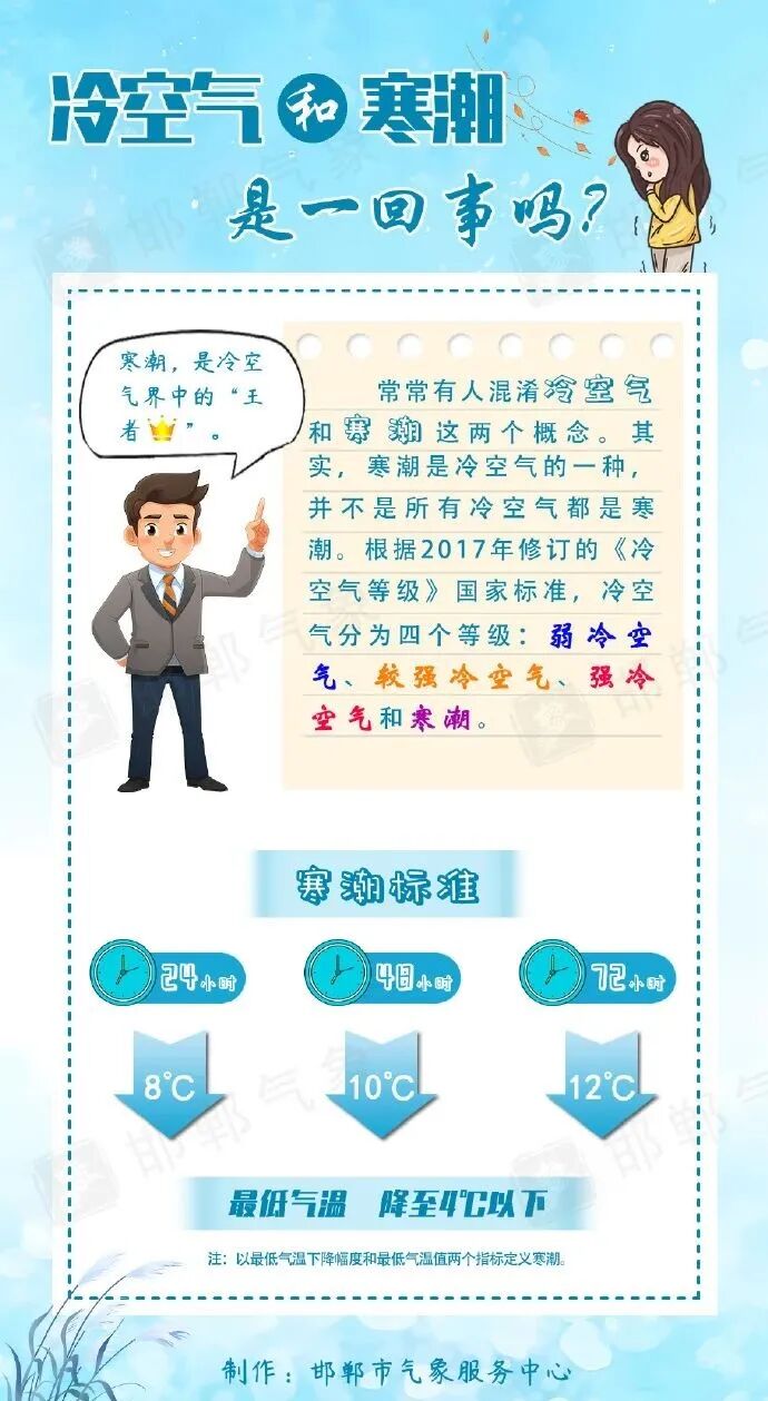 根据强弱程度,我国将冷空气分为四个等级:弱冷空气、较强冷空气、强冷空气和寒潮。在气象学意义上,寒潮有严格的“门槛”。