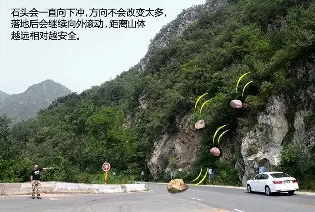 如果是没有经过加固的原生态山体,一般是比较垂直的。发生落石情况时,尽量跑到远处躲避,距离山体越远相对越安全。