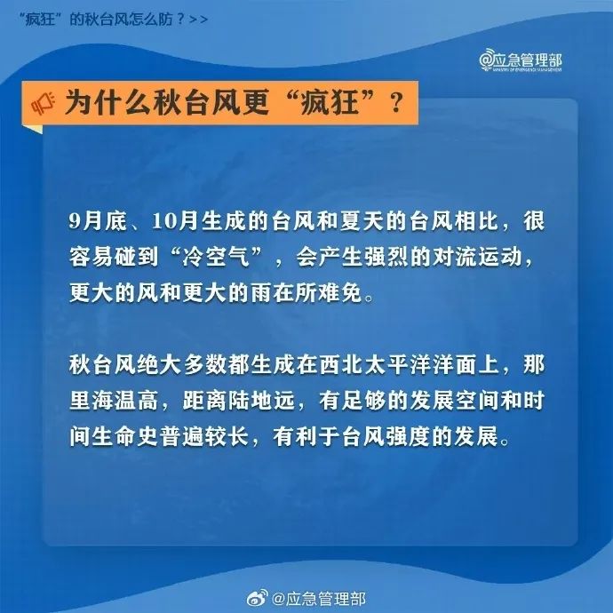 秋台风与夏季生成的台风相比,容易碰上冷气流,对流运动更强烈,同时发展的空间和时间更长,有利于强度增强,因此,秋台风往往更加“疯狂”。
