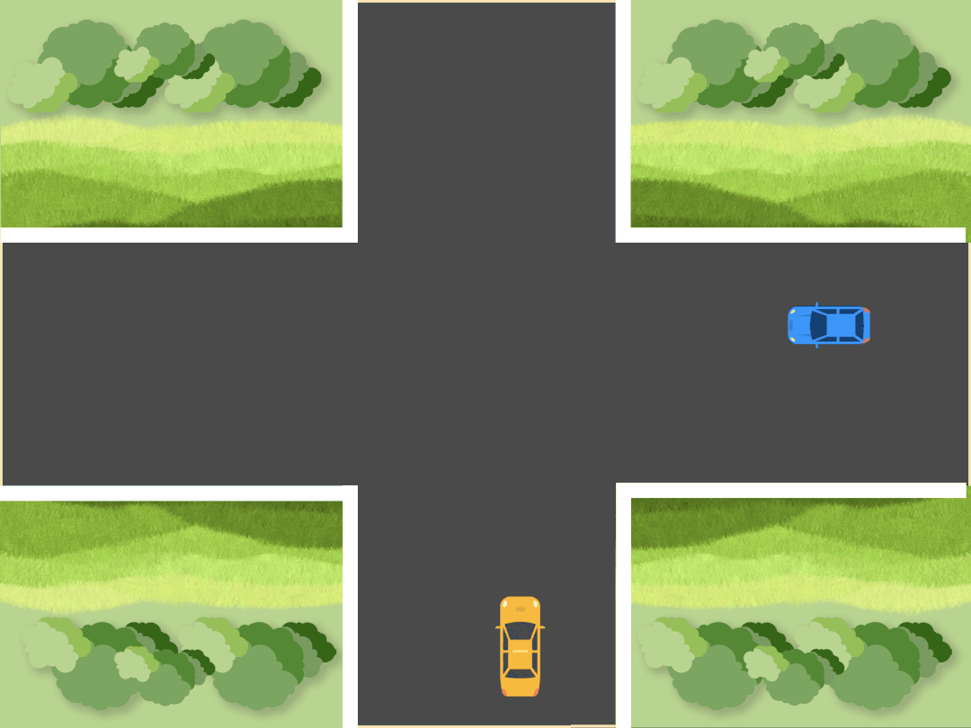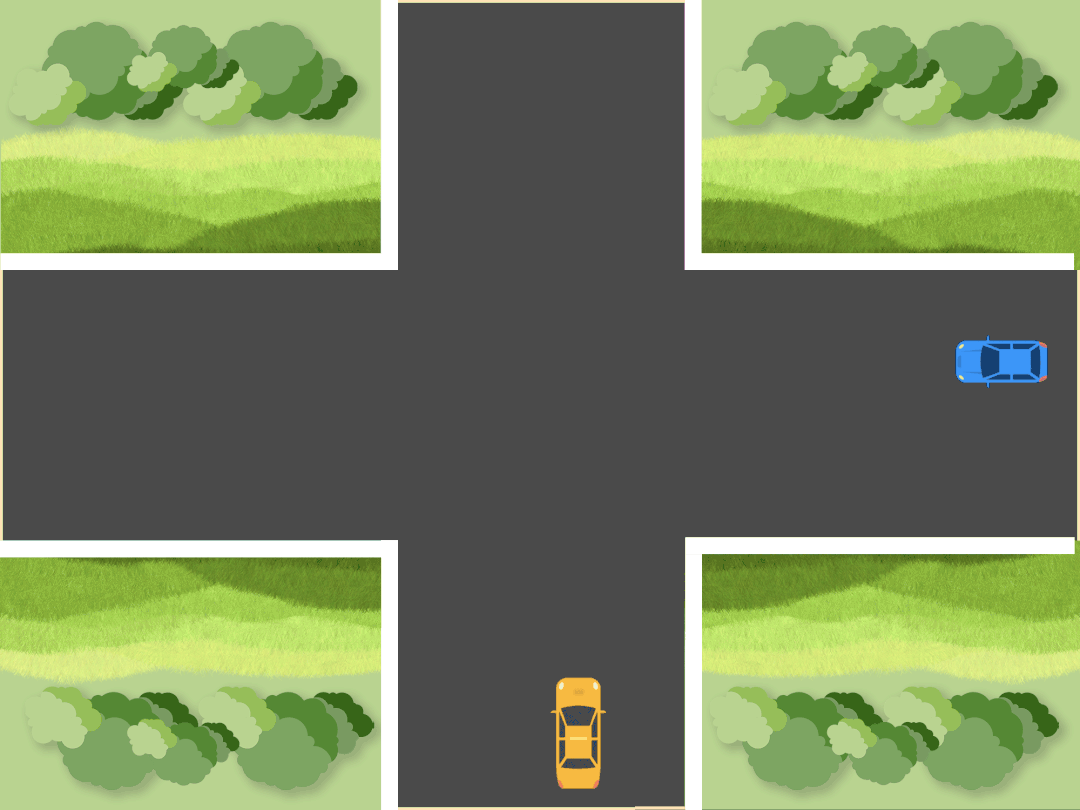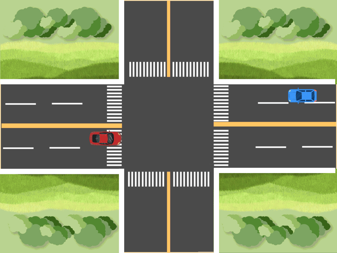在驾车通过没有交通信号灯控制、没有交通标志、标线控制的交叉路口时,两车垂直直行,遵循右侧先行原则,前进方向的右侧车辆拥有优先路权,需要让右侧车辆优先行驶。