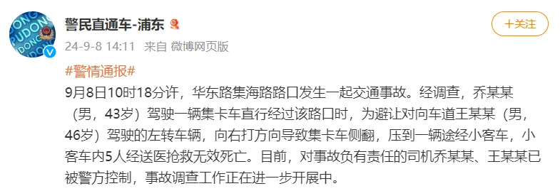 9月8日,上海浦东警方通过微博发布警情通报,当天上午,上海浦东华东路集海路路口,发生一起交通事故,导致5人死亡。