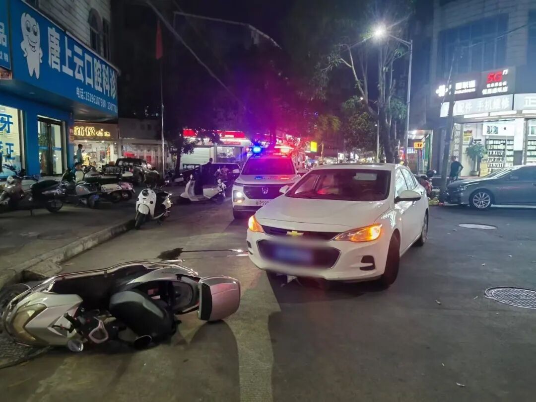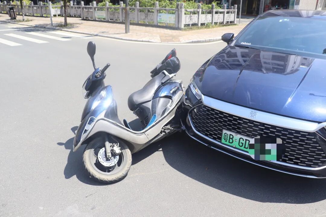 9月2日,防城港市公安局交警支队防城大队接到报警称:防城区振兴路与振兴横街路口处,一辆小轿车与一辆电动车发生碰撞,电动车驾驶人受伤及两车不同程度损坏。接到报警后,民警立即赶往事故现场处置。