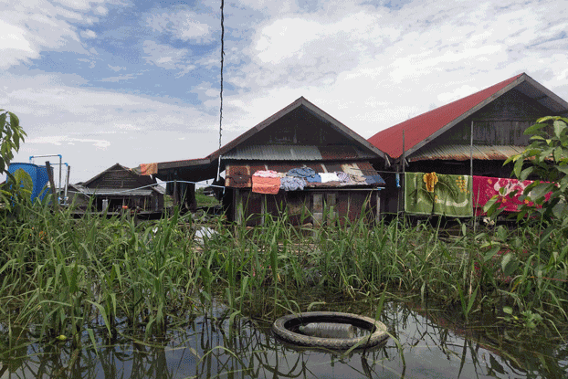 2024年9月14日,台风“摩羯”过后,缅甸南部掸邦茵莱湖的洪水淹没了众多房屋。©AFP