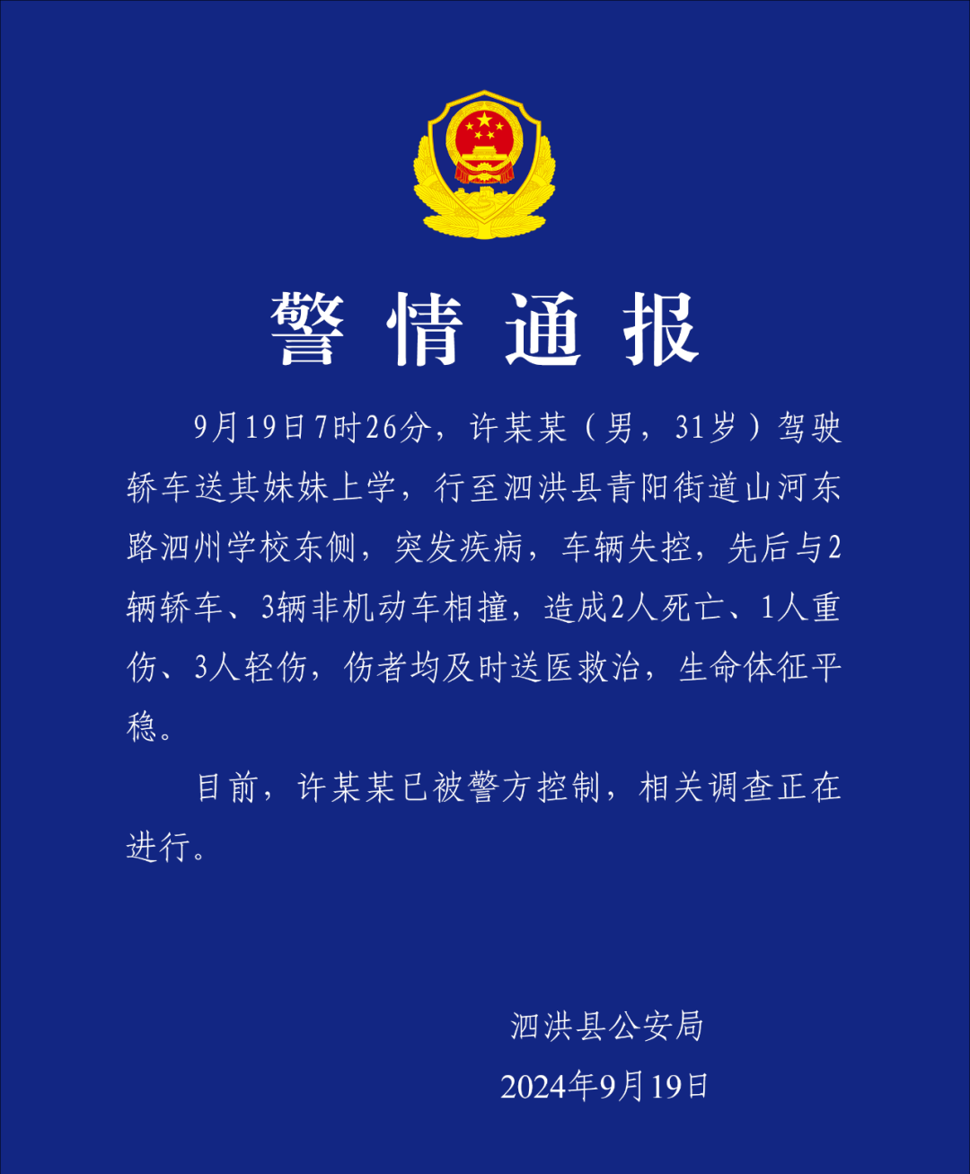 9月19日,江苏省宿迁市泗洪县公安局通报:9月19日7时26分,许某某(男,31岁)驾驶轿车送其妹妹上学,行至泗洪县青阳街道山河东路泗州学校东侧,突发疾病,车辆失控,先后与2辆轿车、3辆非机动车相撞,造成2人死亡、1人重伤、3人轻伤,伤者均及时送医救治,生命体征平稳。