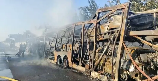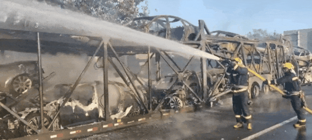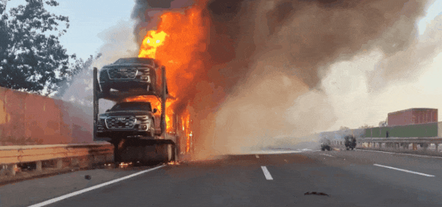 4月,江西宜春,一辆装载有11辆崭新商品车的拖挂车发生火灾,事故造成该拖车与其运载的8辆轿车均被烧毁,预估损失达到500万元以上。