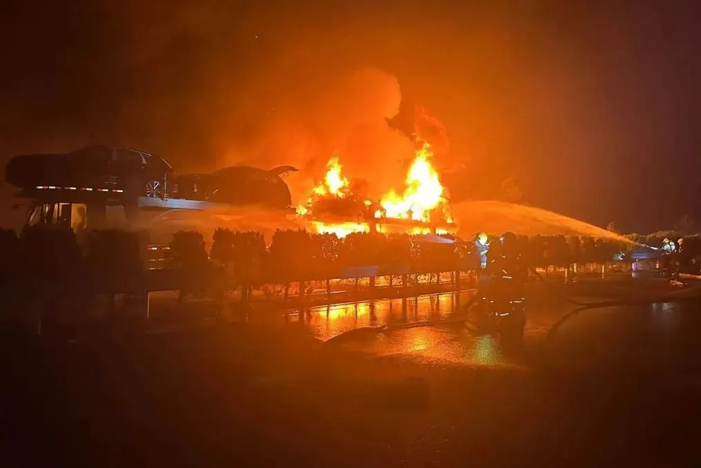 2023年6月,贵州余凯高速一辆载有8辆奥迪新车的拖车突然起火,车上6辆轿车被烧毁,预估损失达到300万元以上。