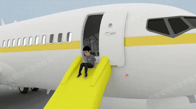 当安全门打开后,充气滑道会自动打开并充气,当充气滑道打开时,首先应摘掉尖锐物品,向前跃起抬腿,以臀部接触滑道。