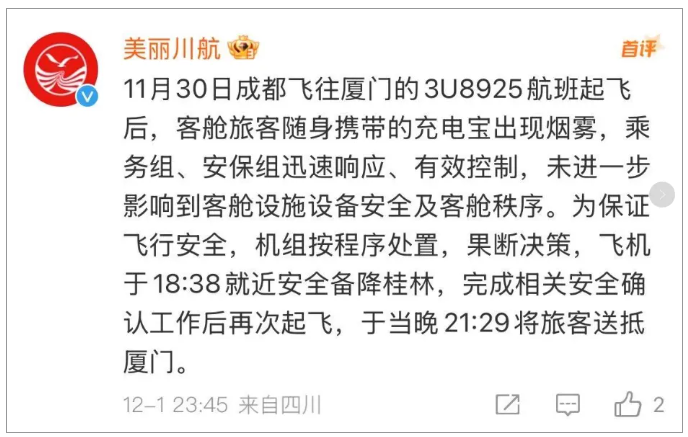 12月1日23时45分,@美丽川航 官方账号留言回应,11月30日,成都飞往厦门的3U8925航班起飞后,客舱旅客随身携带的充电宝出现烟雾。