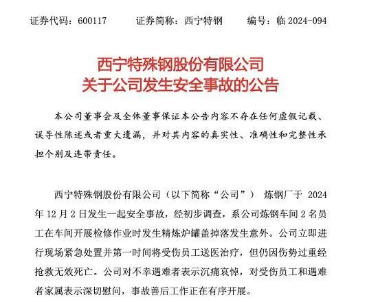 西宁特殊钢股份有限公司12月3日公告称,公司炼钢厂于2024年12月2日发生一起安全事故,经初步调查,系公司炼钢车间2名员工,在车间开展检修作业时,发生精炼炉罐盖掉落发生意外。公司立即进行现场紧急处置,并第一时间将受伤员工送医治疗,但仍因伤势过重经抢救无效死亡,事故善后工作正在有序开展。截至目前,事故原因与人员伤亡原因还在进一步分析调查中,检维修作业环节安全隐患多,企业设备管理不到位,检维修作业制度执行不到位,安全风险辨识不到位、安全意识淡薄等,都有可能导致意外发生。