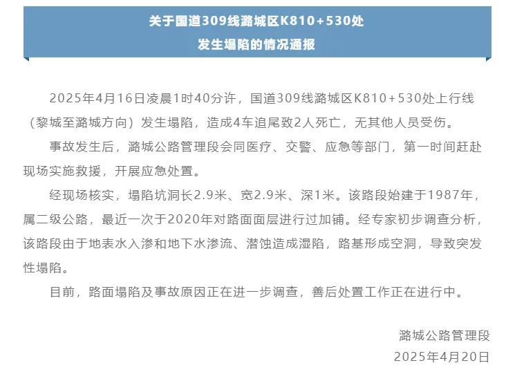 据山西省潞城融媒官微消息,2025年4月16日凌晨1时40分许,国道309线潞城区K810+530处上行线(黎城至潞城方向)发生塌陷,造成4车追尾致2人死亡,无其他人员受伤。