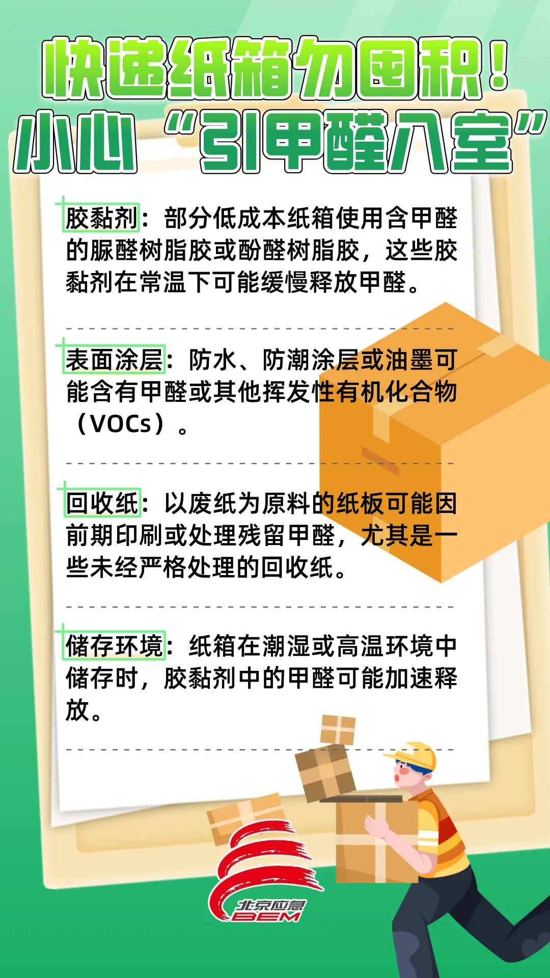 当大量新纸箱、壁纸或涂有防水层的纸制品堆放在狭小空间,就有可能造成甲醛污染。因此,新拆封的快递纸箱、尼龙袋等包装含有胶黏剂和印刷涂层,应尽快清理或放置在通风处使其散味,或者直接在快递站拆掉包装并扔掉,不宜长期囤积于卧室或狭小空间。