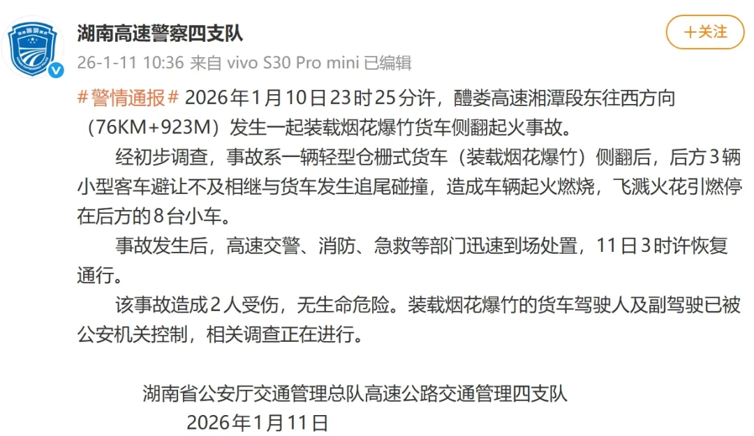 1月11日,湖南高速警察四支队发布警情通报: