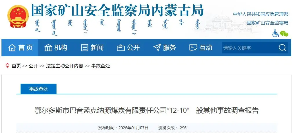 1月7日,国家矿山安全监察局内蒙古局公布了《鄂尔多斯市巴音孟克纳源煤炭有限责任公司“12·10”一般其他事故调查报告》。