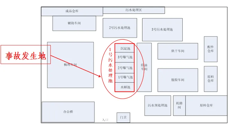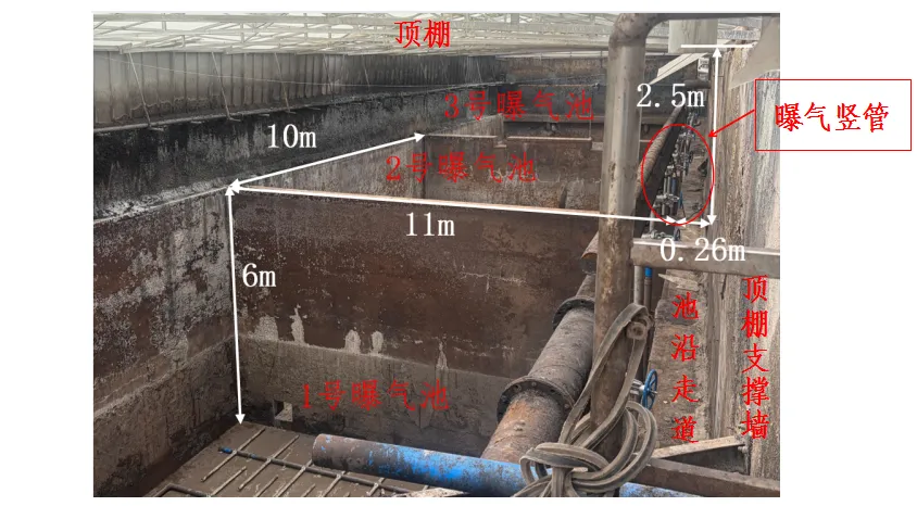 该企业于2026年1月24日停产,进行年底例行设备检维修工作。由于曝气池中的曝气竖管锈蚀,2月3日企业组织相关人员对1号污水处理池内的曝气竖管进行更换。1号污水处理池包括1个水解池、3个曝气池和1个沉淀池。3个曝气池的尺寸均为11米(长)×10米(宽)×6米(深),底部通过孔洞联通。事发曝气池实景图见图2。
