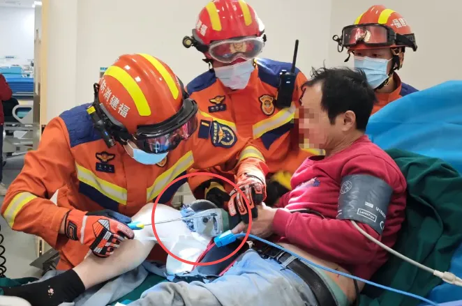 福建龙岩一男子在进行切割作业时不慎受伤,右大腿被小型手持式角磨机割伤,金属锯片紧紧嵌入皮肉中,因处置难度较大,医院向辖区消防部门请求协助。
