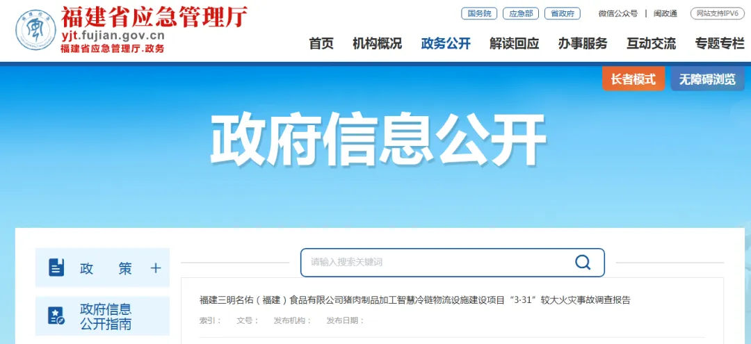 2025年3月31日,位于三明市三元区的名佑(福建)食品有限公司猪肉制品加工智慧冷链物流设施建设项目发生火灾,事故导致5人死亡、6人受伤,过火面积约4500平方米。