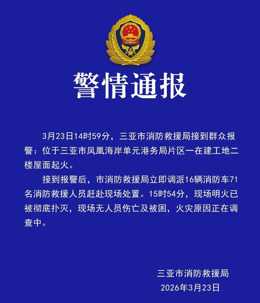 2026年3月23日14时59分,三亚市天涯区建港路一在建工地发生火灾,三亚市消防救援支队指挥中心接到报警后,立即调派16辆消防车,71名消防救援人员赶赴现场处置。