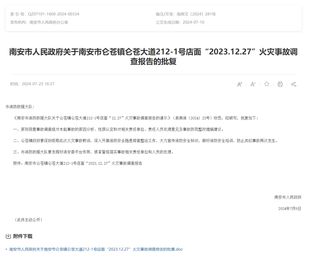 经调查认定,该起事故起火原因为林某明厨房炊事用火不慎引燃周边可燃物引发火灾。日前,南安市人民政府发布了该起事故调查报告,公布了事故详情。
