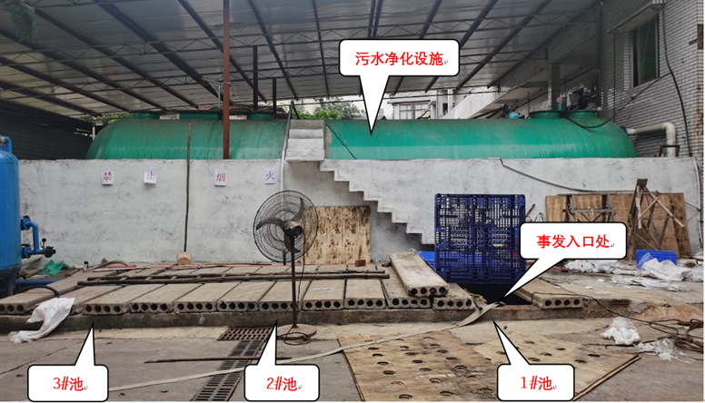 车间内的污水池长8.1m、宽3m、深3m,污水池顶部用混凝土预制板进行覆盖,并铺设一层人造草皮。池内用砖砌筑隔断,分隔为1#、2#、3#共3个池,通过孔洞互相连通逐级沉淀,事故发生在1#池。据了解,污水池内污水达到一定高度后抽至污水处理设备净化后排放,企业每季度组织对污水池进行清理。7月28日20时30分,企业法人周某兵组织王某政、杨某亨和陈某国3人在1#池抽水,准备抽干后对池底部残渣进行清理。21时30分,1#池内水位抽至距离池底约30cm时,周某兵安排王某政进入1#池内,将抽水泵移动至低洼处再继续抽水。王某政通过木梯进入池内,1分多钟后晕倒。
