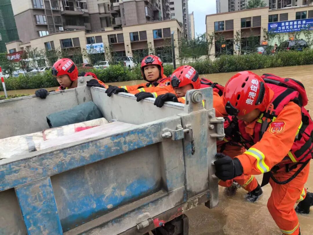 贵港市应急救援队伍帮助群众把抛锚的汽车推离积水处。