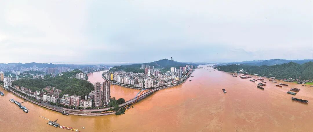 受强降雨影响,截至6月18日17时许,梧州水文站水位20.43米(警戒水位18.5米),超警戒1.93米,相应流量31400立方米每秒。图为洪水经过桂江与西江交汇处。广西云-广西日报记者 梁乾胜 通讯员 麦好明/摄
