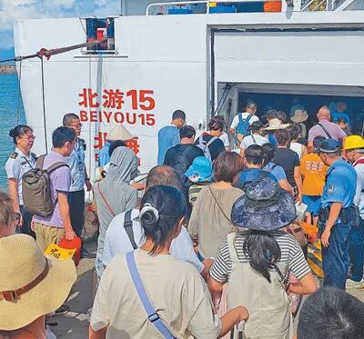 7月21日,在台风到来前,广西北海相关部门疏散游客乘船离开北海涠洲岛。 庞革平 王丽娟摄影报道