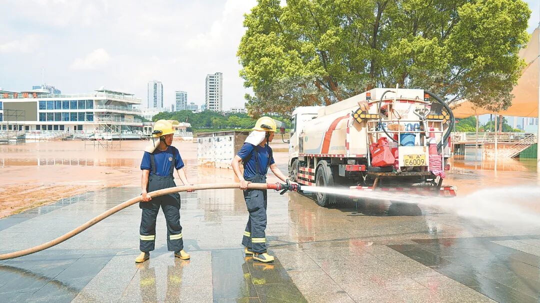 9月15日,在南宁市亭子码头,消防救援人员用高压水枪冲洗淤泥。广西云-广西日报记者 乔晓莹 通讯员 傅永顺/摄