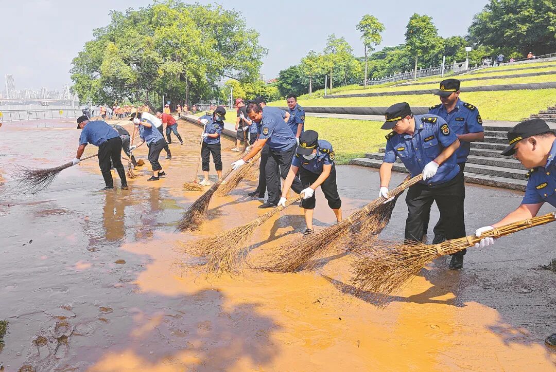 自9月14日上午以来,南宁市市政园林局派出6个检查指导组深入邕江沿岸公园一线,持续对退水阶段的整治恢复工作进行检查指导,督促做好淤泥清理等工作。自退水以来,全市累计出动人员4218人次、车辆276辆次、冲洗设备411台班,对沿岸公园广场、步道、亲水平台等区域进行淤泥清理,共清理淤泥面积达59.03万平方米,工作取得阶段性成效。
