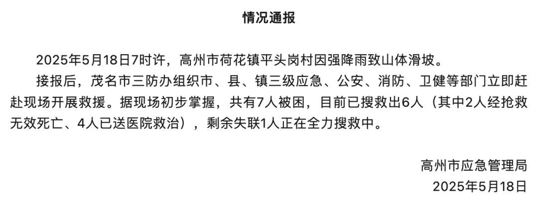 2025年5月18日,广东茂名高州市应急管理局发布通报:5月18日7时许,高州市荷花镇平头岗村因强降雨致山体滑坡。